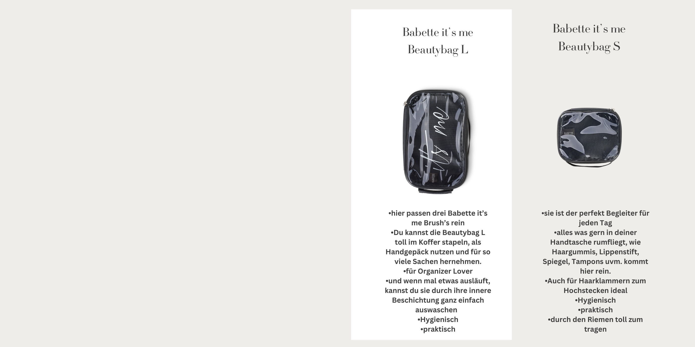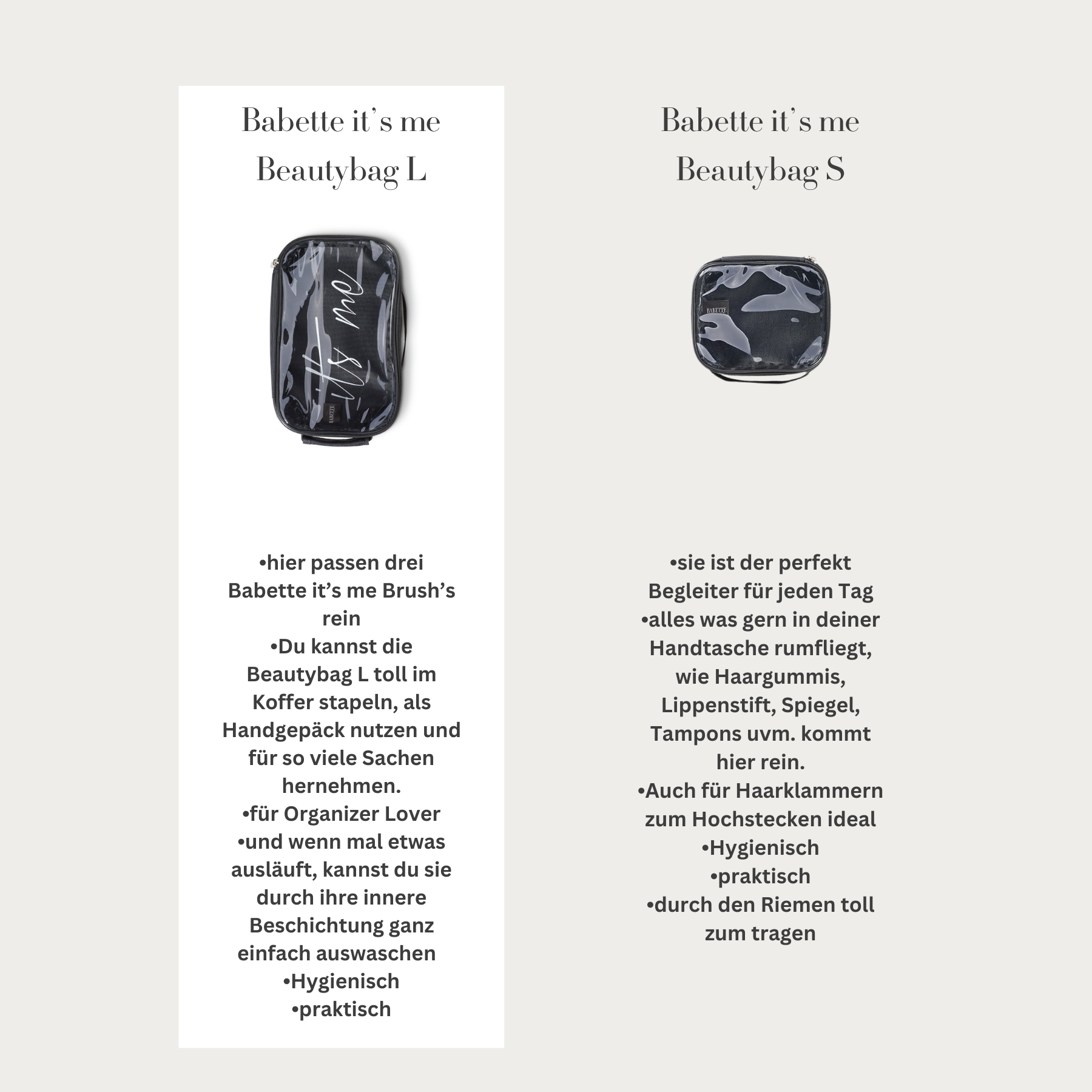 Die Babette it’s me Beauty Bag bringt endlich Ordnung in dein Reisechaos. Mit zwei clever designten Größen passt sie exakt in Koffer oder Handgepäck – ganz ohne Platzverschwendung.
